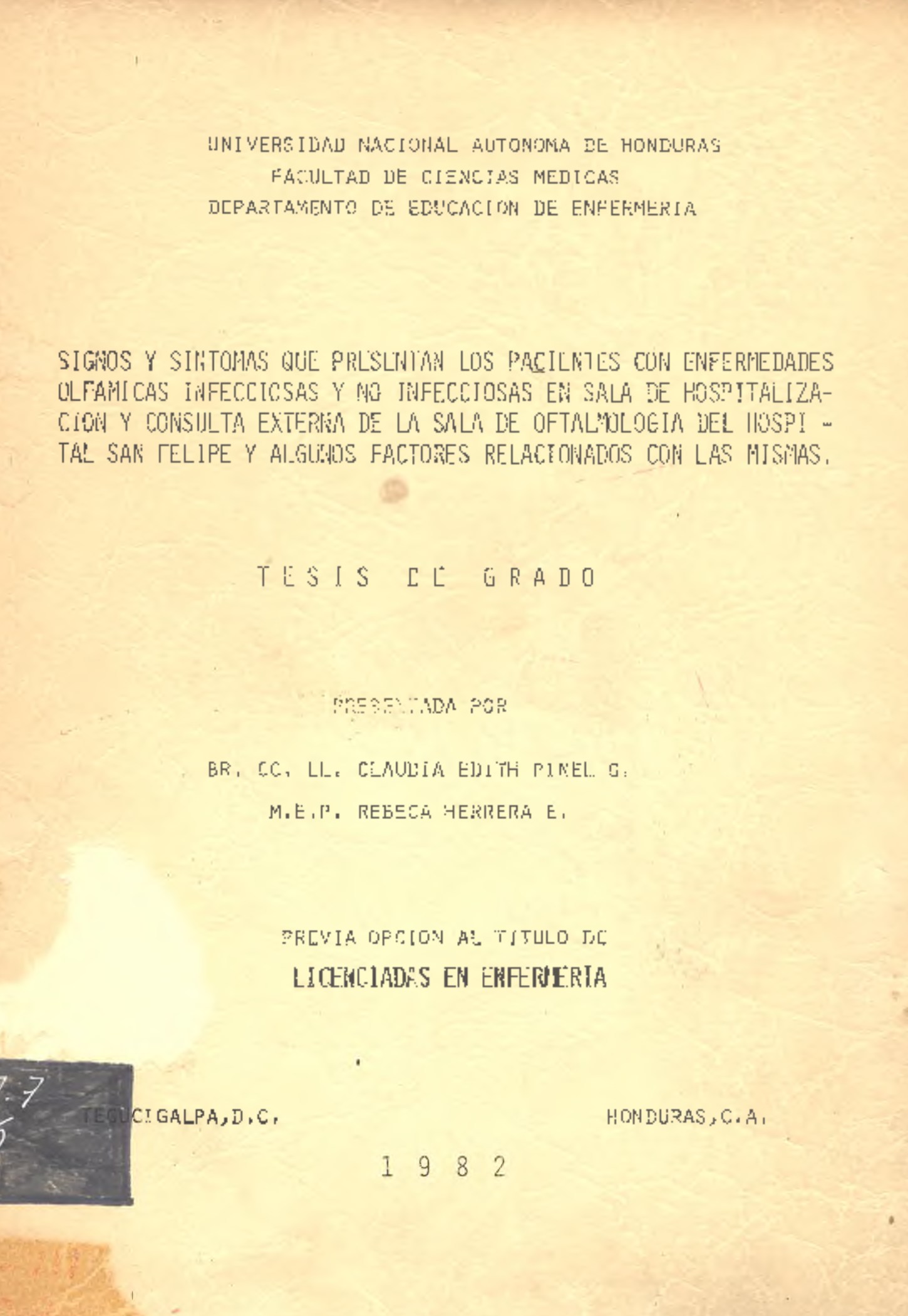 SIGNOS Y SINTOMAS QUE PRESENTAN LOS PACIENTES CON ENFERMEDADES OLFAMICAS INFECCIOSAS Y NO INFECCIOSAS EN SALA DE HOSPITALIZA?CION Y CONSULTA EXTERNA DE LA SALA DE OFTALMOLOGIA DEL HOSPITAL SAN FELIPE Y ALGUNOS FACTORES RELACIONADOS CON LAS MISMAS