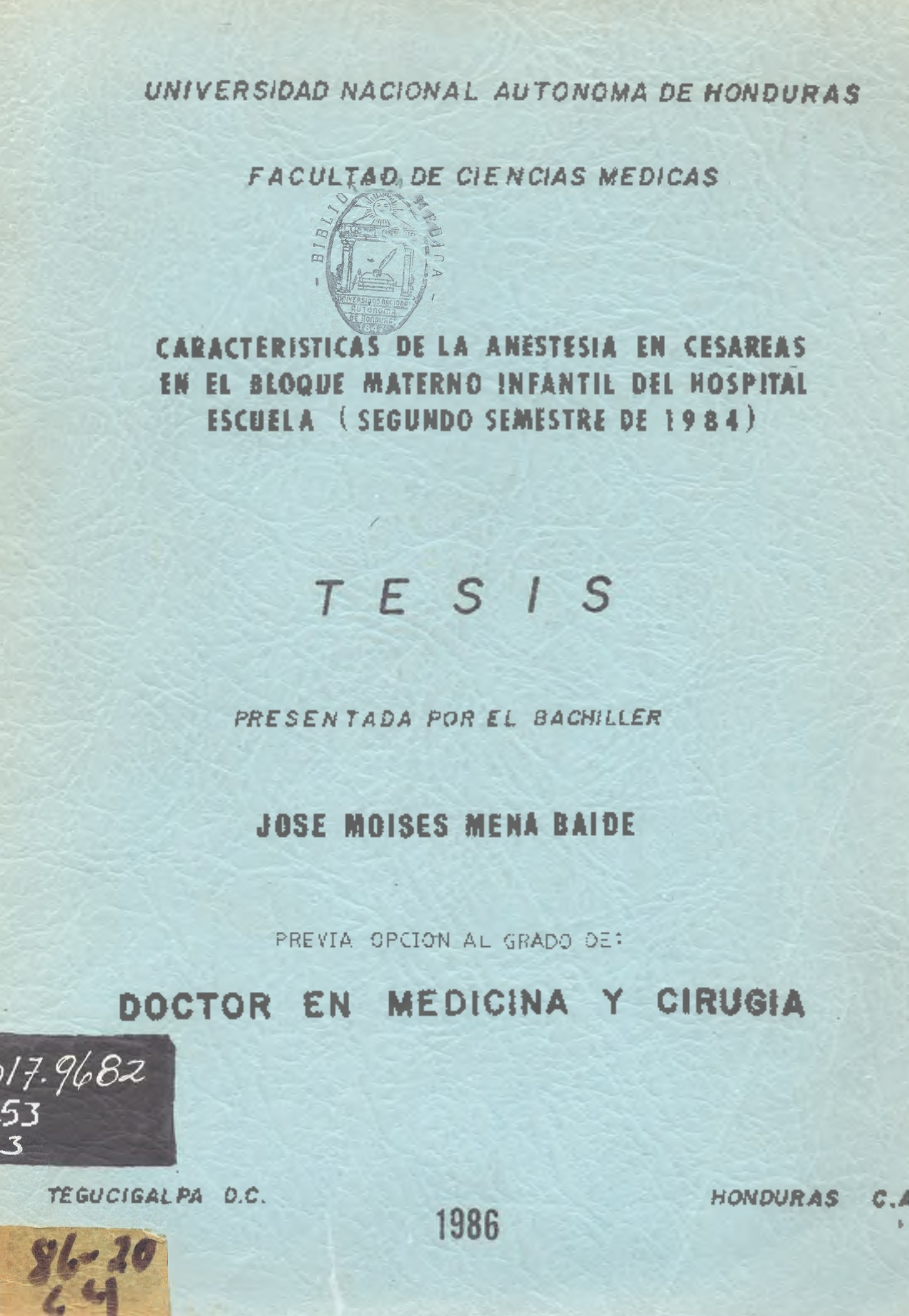 CARACTERISTICAS DE LA ANESTESIA EN CESAREAS EN EL BLOQUE MATERNO INFANTIL DEL HOSPITAL ESCUELA (SEGUNDO SEMESTRE DE 1984)