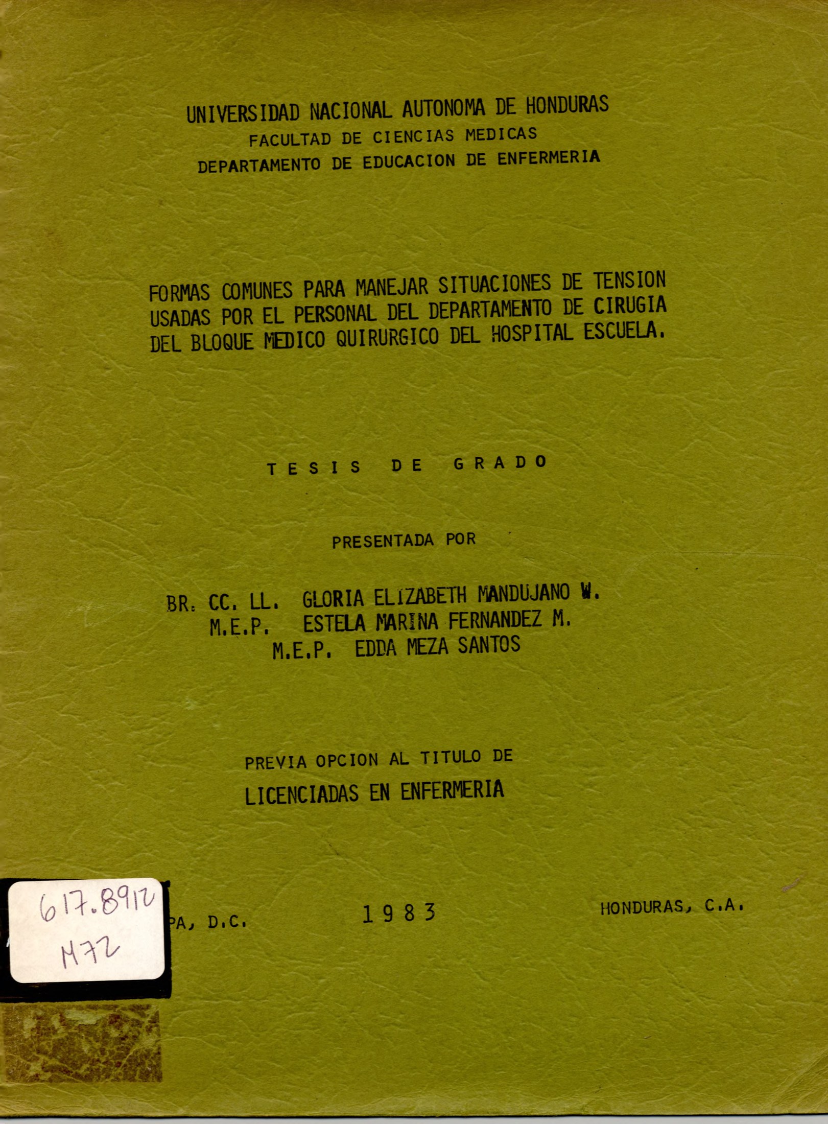 FORMAS COMUNES PARA MANEJAR SITUACIONES DE TENSION USADAS POR EL PERSONAL DEL DEPARTAMENTO DE CIRUGIA DEL BLOQUE MEDICO QUIRURGICO DEL HOSPITAL ESCUELA