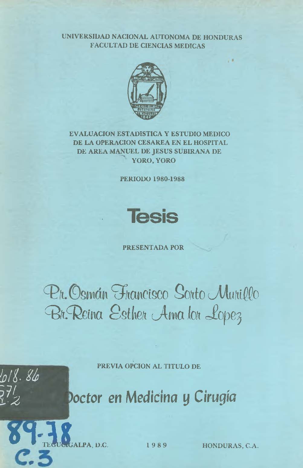 EVALUACION ESTADISTICA Y ESTUDIO MEDICO DE LA OPERACION CESAREA EN EL HOSPITAL DE AREA MANUEL DE JESUS SUBIRANA DE YORO.YORO Periodo 1980-1988
