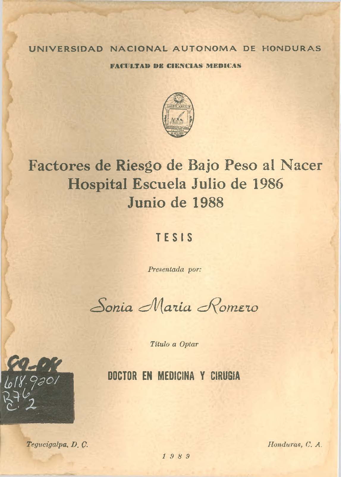 Factores de Riesgo de Bajo Peso al Nacer Hospital Escuela Julio de 1986 Junio de 1988.