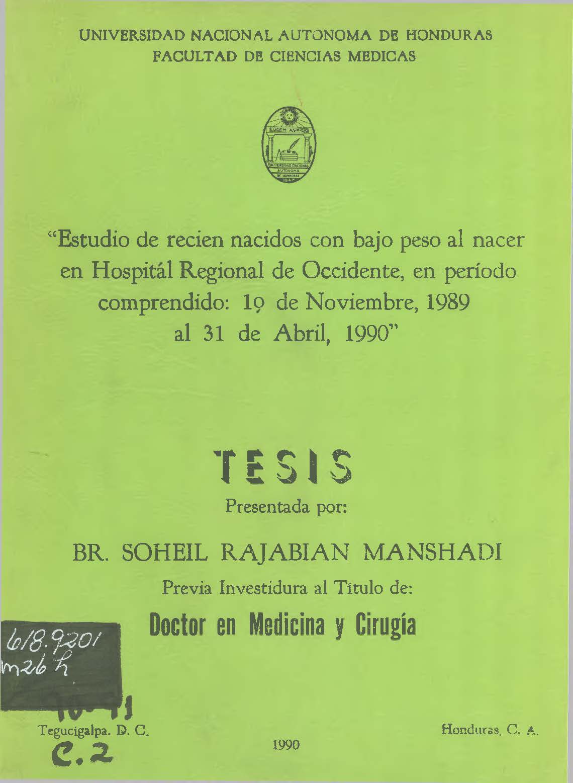 Estudio de recien nacidos con bajo peso al nacer en Hospital Regional de Occidente, en período comprendido: lo de Noviembre, 1989 al 31 de Abril, 1990.